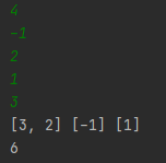위 출력 화면을 보게 되면 양수 리스트인 po 리스트에 양수인 3과 2가 내림차순으로 정렬되어 있는 것을 확인할 수 있고 음수, 0 리스트인 ne 리스트에 음수 -1이 있는 것을 확인할 수 있고 1 리스트인 one 리스트에 1이 있는 것을 확인할 수 있다. 따라서 양수 리스트를 묶어주면 6이 되고 음수, 0 리스트는 -1이 하나이기 때문에 묶을 필요가 없어 혼자 나오게 되고 one 리스트는 1을 결과값에 더해주면 된다. 따라서 식은 (-1)+1+(2*3) = 6 이 된다.