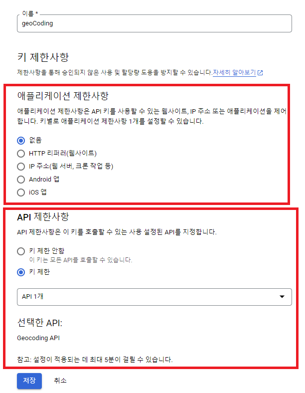 위 사진처럼 API 키 제한을 한 후 저장을 한다.