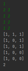위 출력 화면을 보게 되면 처음에 모든 구간에 책이 있는 것을 확인할 수 있다. (여기서 계수 정렬을 통해 문제가 수행되므로 0을 무시하는 대신 책을 n+1 권을 만드는 것이다.) 정렬한 구간에서 첫 번째 구간인 1-2를 먼저 확인한다. 1구간에는 책이 있으므로 책을 주고 학생 수를 카운트한다. 따라서 [1, 0, 1] 모양으로 구간의 책을 확인할 수 있다. 그리고 다시 두 번째 구간인 1-2를 확인한다. 1구간에는 책이 없으므로 2구간을 확인하고 2구간에는 책이 있으므로 2구간에 있는 책을 학생에게 줘 학생 수를 카운트한다. 다음 세 번째 구간인 1-2를 확인하는데 1-2구간에는 모두 책이 없으므로 학생에게 줄 책이 없어진다. 구간을 모두 확인했으므로 이때의 테스트 케이스에서 책을 준 학생을 출력한다. 그리고 위 과정을 테스트 케이스만큼 반복한다.
