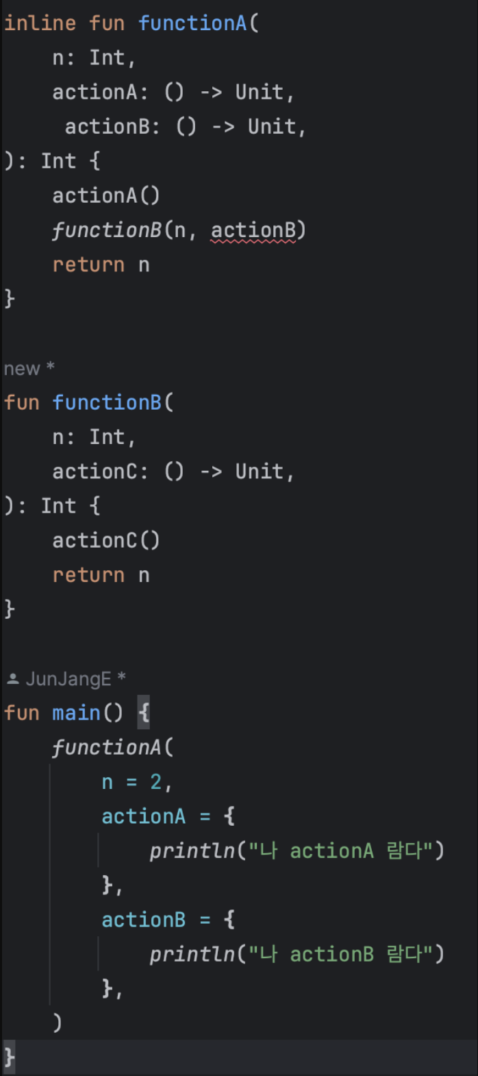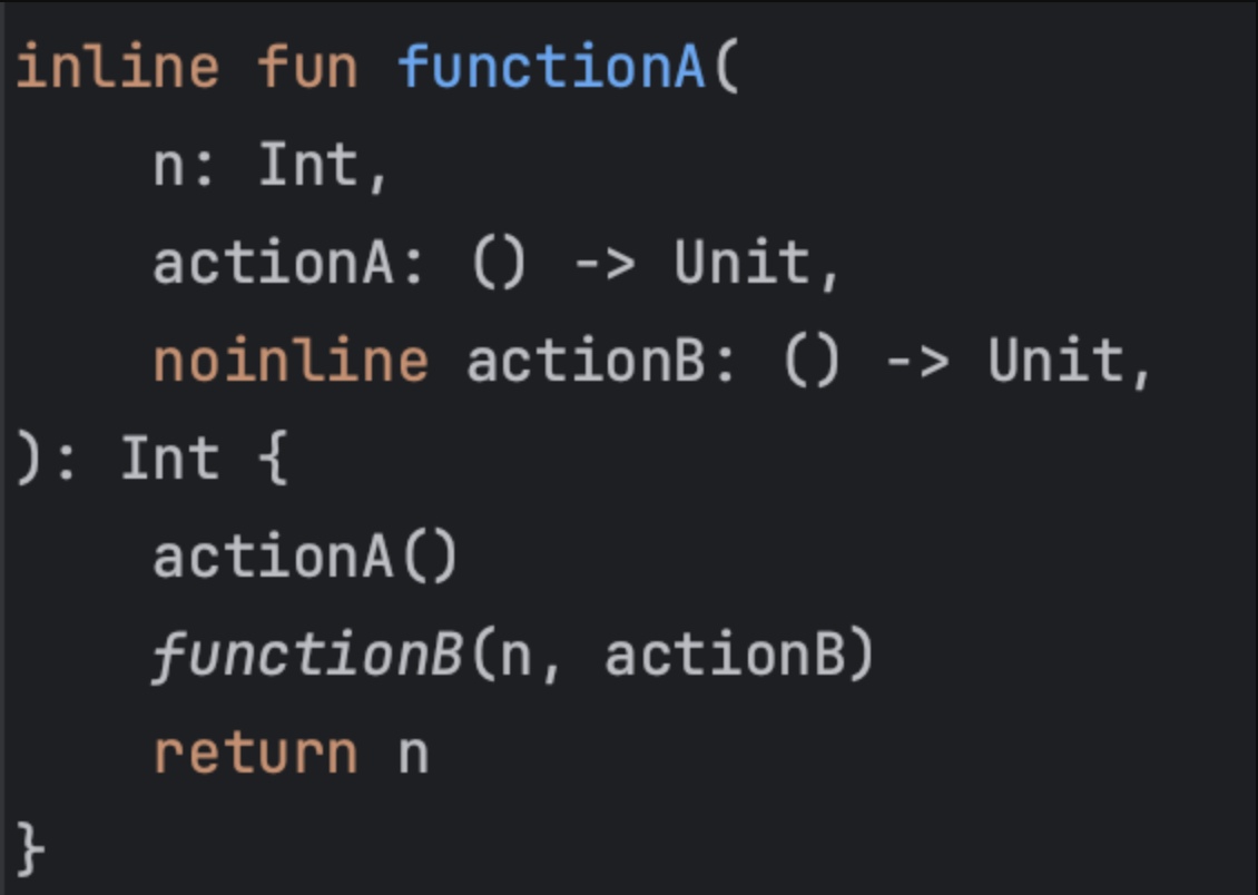 위 코드를 보면 actionB는 functionB에서 사용된다. 우리는 actionB를 전달하고싶기 때문에 noinline 키워드를 붙여보자.