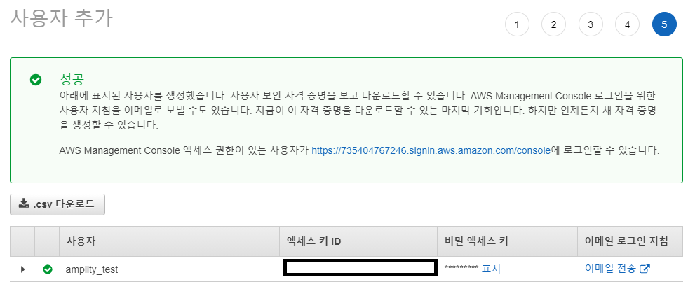 비밀 액세스 키는 이 창에서 나가면 다시는 확인할 수 없으므로 .csv 파일을 다운로드하여 저장해준다.